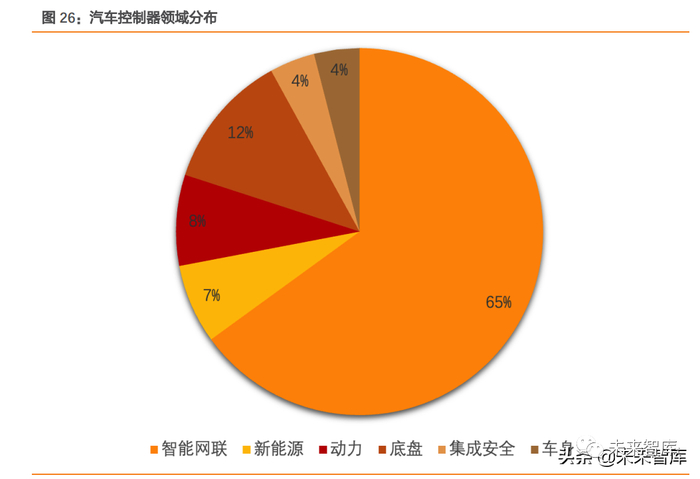 整车含控制器数量约为 40-80 个,其中汽车的科技配置越高、则控制器数量越多,同等科 技配置条件下,新能源汽车车型的控制器略多。我们看好智能化+网联化时代下大型控制器数量增加,汽车控制器量价齐升。从汽车控制 器来看,65%为智能网联、7%为新能源、8%为动力、12%为底盘、4%为集成安全、4%为车身。