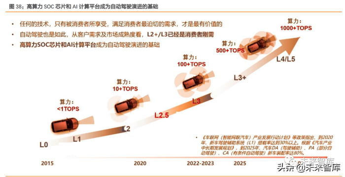 算力随着智能化提升不断提升,L1 需要<1TOPS 算力,L2 为 10+TOPS 算力,L3 为 100+TOPS 算力, L4 为 500+TOPS 算力,L5 为 1000+TOPS 算力,高算力需求推动 SOC 芯片和 AI 计算 平台迭起。
