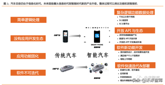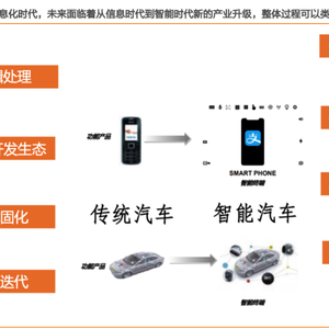 智能化驱动下汽车行业有望实现产业变革升级,加速步入万物互联+万物智联的新时代。 目前消费电子已经先一步步入智能化时代,而汽车行业目前落后于消费电子(功能机到智 能机)行业仍处在信息时代,未来面临着从信息时代到智能时代新的产业升级,整体过程 可以类比功能机到智能机。