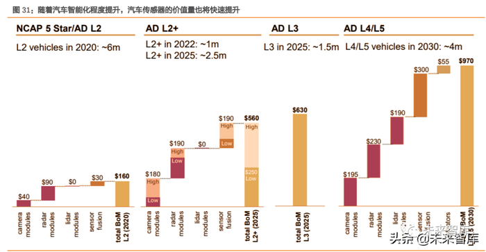 随着汽车智能化程度提升,汽车传感器的价值量也将快速提升。根据英飞凌预测,L2 车需 要的传感器价值量为 160 美元,到 L4、L5 级别的汽车需要则提升为 970 美元。