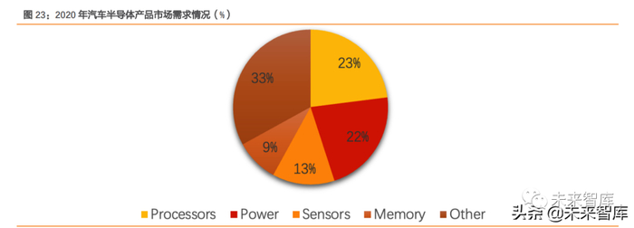 2020 年汽车半导体产品市场需求情况:主控芯片占比 23%,功率半导体占比 22%,传感器 占比 13%,存储芯片占比 9%,其他占比 33%。