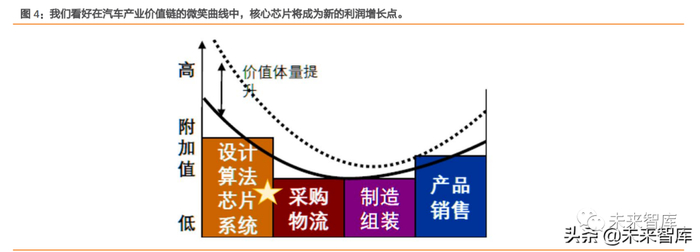 汽车智能化带来的是汽车整体产业价值链构成的升级,我们看好在汽车产业价值链的“微 笑曲线”中,汽车芯片将在智能化赋能下重估,将成为汽车新的利润增长点。随着汽车步 入智能化时代,产业链两端高附加值区域将出现新的利润增长点及企业,高附加值将不再 来自传统车身、底盘等领域而是集中在核心芯片、软件、服务等等领域。