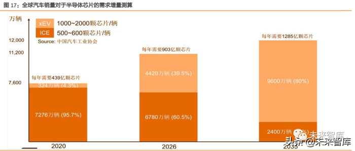 假设传统汽车需要的半导体芯片为 500-600 颗芯片/辆,新能源汽车需要的半导体芯片为 1000-2000 颗芯片/辆:以 2020 年传统汽车销量 7276 万台测算,新能源汽车 324 万台测算,整体全球需要的汽车 芯片为 439 亿颗每年。预计 2026 年传统汽车销量 6780 万台测算,新能源汽车 4420 万台测算,整体全球需要的 汽车芯片增加为 903 亿颗每年。预计 2035 年传统汽车销量 2400 万台测算,新能源汽车 9600 万台测算,整体全球需要的 汽车芯片增加为 1285 亿颗每年。