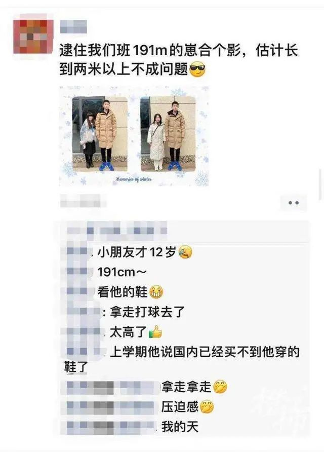 这位老师在朋友圈上写道:“逮住我们班191的崽合个影,估计长到两米以上不成问题。”