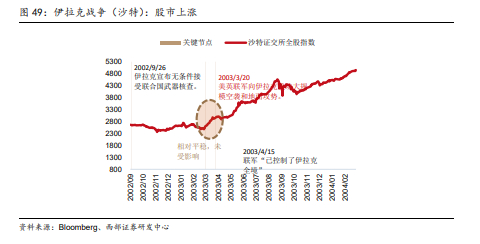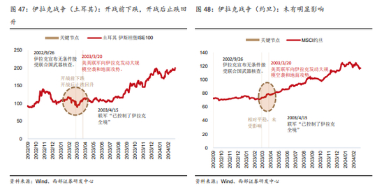 伊拉克战争期间,仅土耳其股市有一定表现,约旦和沙特股市并未有负面表现。伊拉克战争期间,几个接壤国股市的表现不一,土耳其股市受战争影响相对明显,正式开战前下跌,但开战后止跌回升;约旦和沙特股市几乎未受战争影响。