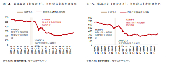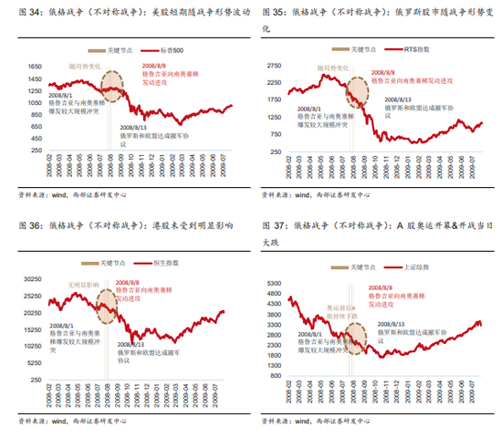 港股、A股:俄格战争进程阶段来看,港股和A股受到的影响相对有限,下跌更多处于熊市进程中。对比港股和 A 股,由于俄格战争开战期间,恰逢奥运会,叠加中国与俄罗斯的战略地理位置关系,A股下跌幅度较港股较大。