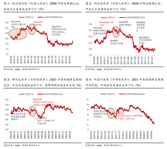 长周期来看,美债收益率的走向最终取决于美联储周期。对比历次战争期间所处的美联储周期,可以看到美债收益率的最终走向与降息、加息周期基本一致。不过,即使同处于同一政策周期,如果处于降息周期的阶段不同,受到政策预期变化影响,美债收益率的表现也会出现分化。例如同处于2001年至2003年美联储降息周期的伊拉克和阿富汗战争,阿富汗战争处于降息开启之前,美债收益率的趋势长期走低;而伊拉克战争的开战阶段处于此轮降息周期尾声,美债收益率长期则是处于上行通道。