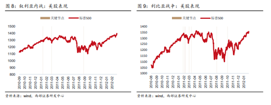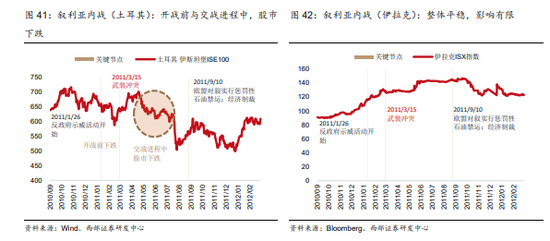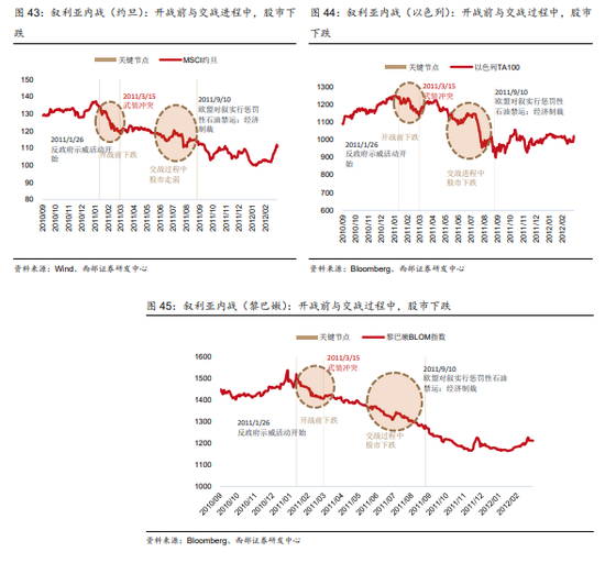 一是接壤国股市出现负面冲击,多在开战前后以及交战进程中,可以理解为交战前已经引发地区动荡,对接壤国经贸产生影响。例如叙利亚内战在开战和交战进程中,都出现下跌;利比亚战争期间,接壤国突尼斯股市在开战前和交战进程中有小幅下跌。