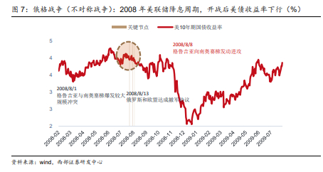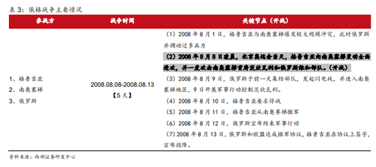 一是影响程度来看,对于资产价格的影响更多是短期的冲击,但宏观层面的影响更为显著。相比另六次战争,俄格战争交战时间仅持续一周的时间,且发生突然,对资产价格的影响更小、也更短。实际上,由于俄格战争发生期间正值金融危机,宏观层面影响更为显著。