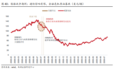 俄格短期开战期间,原油价格暴跌更多是全球金融危机带来对需求的担忧,避险情绪此时并非主导因素。与美元、黄金的表现类似,大宗商品中以原油为例,俄格战争爆发期间正处于次贷危机蔓延阶段,因对全球经济增长的担忧,原油价格持续暴跌。而短期开战对原油价格的影响十分有限。