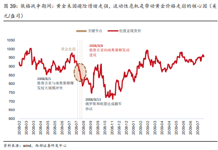 俄格短期开战期间,避险情绪非黄金价格的核心矛盾,流动性危机令黄金处于走弱阶段。俄格开战期间,黄金正处于持续下跌进程中,避险情绪并非主导,而是次贷危机全面爆发为金融危机,市场陷入流动性危机,带来投资者抛售回补股市流动性,并进一步带动黄金价格的走弱。