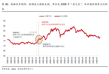 俄格交战期间,美元指数持续上涨,与2008年美元走强趋势一致,但更多是“美元荒”带来的上涨,战争避险情绪占比较低。从2008年美元长期趋势来看,尽管因次贷危机美联储接连降息并进行量化宽松,但由于非美元贬值严重,进而出现的“美元荒”,美元反而走出一波上涨行情。在美元指数长期走强的趋势中,短期俄格交战期间,美元指数短期也保持持续走强。但整体来看,短期避险情绪对美元的影响占比较低。