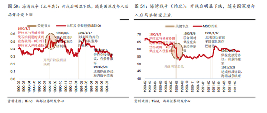 海湾战争期间,土耳其和约旦股市表现随局势变化,与美股的U型走势相近。在开战初期伊拉克入侵科威特阶段,土耳其和约旦股市均表现为明显的下跌;之后随着美国出兵,局势反转明朗后,两国股市转而上涨。