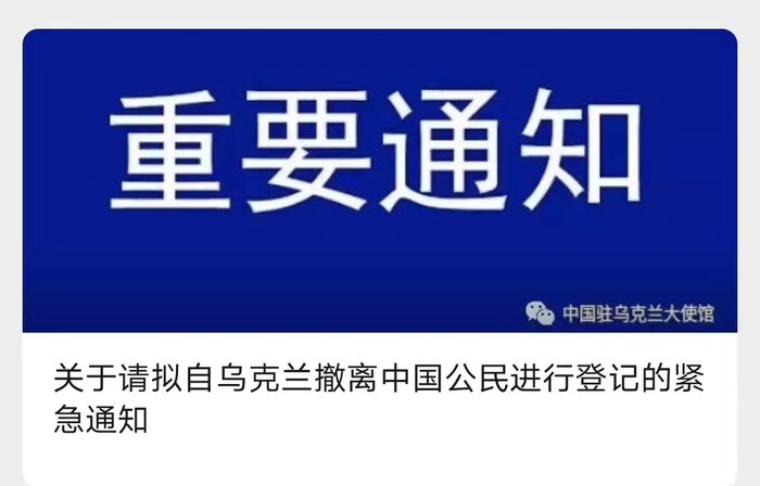 2月25日凌晨,中国驻乌克兰大使馆微信号发布重要通知,当前,乌克兰国内局势急剧恶化,我在乌公民和中资企业处于较高安全风险。为准备分批包机接返有关事宜,现开始人员登记。搭乘包机根据自愿原则。包机派出时间根据飞行安全情况确定,届时将提前通知。