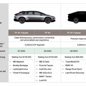 从FF的三款产品规划来看 ,FF 81起售价为59,000美元,对标蔚来ES8,宝马5系。FF 71则面向大众市场,起售价为45,000美元,对标Model 3/Y 。