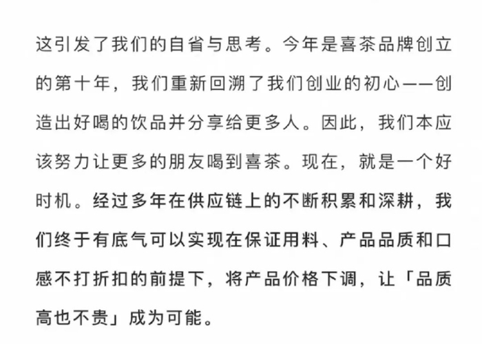 此次价格调整,喜茶挑了一个时间节点,那就是品牌创立的第十年,有重回创业初心的意味。而对于新的价格体系,喜茶也对自己下了一个新的定义,那就是做“品质高也不贵”的茶。