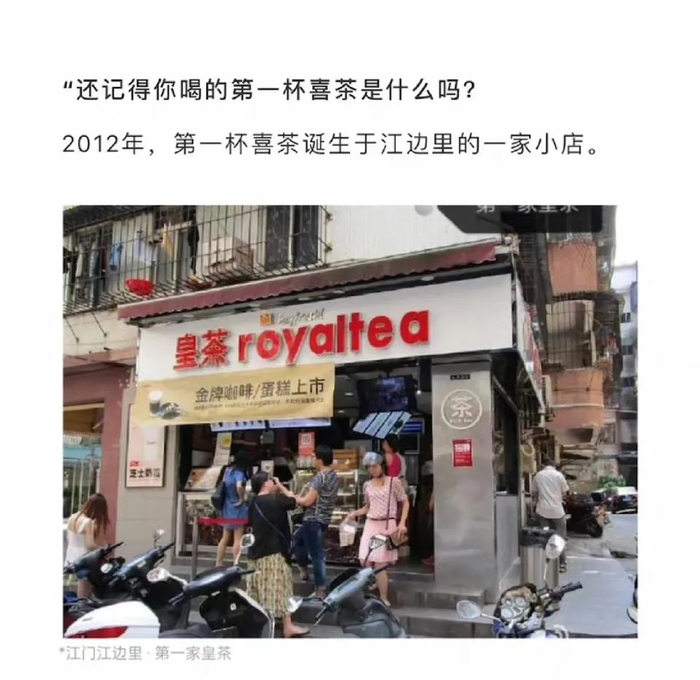 在官宣降价的文案里,喜茶问了一个问题“还记得你喝的第一杯喜茶是什么吗?”之后贴出了喜茶第一家路边店的照片,那个时候的喜茶还叫皇茶。