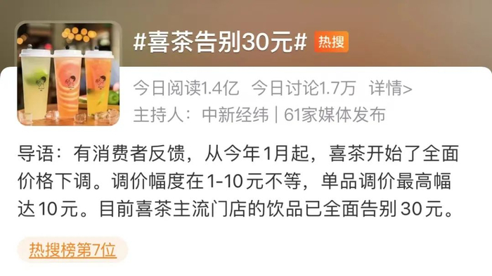 随后喜茶也证实,的确对部分商品进行了调价。例如纯茶类降价3-5元,5款水果降价2-3元,芝士降1元。