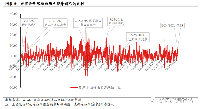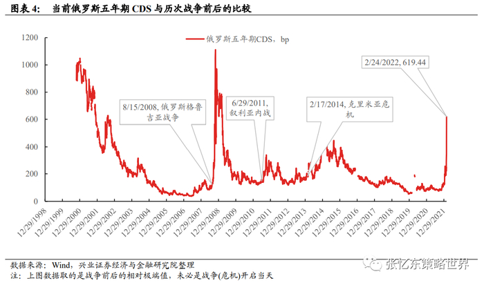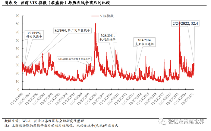 相比于过去5次战争,当前反映市场避险情绪的指标均处于极端的水平,包括,俄罗斯五年期CDS、金价的涨幅、VIX指数、美债波动率等(见下文图表)。