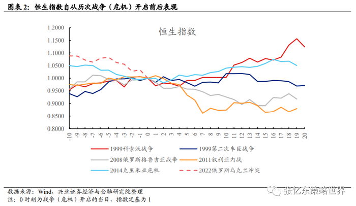 在战争开始之后的20个交易日的表现来看,除了2008年格鲁吉亚(后接全球金融危机)、2011年叙利亚内战(欧债危机酝酿期)后,中国市场均在战争(危机)开启后一星期内见底。恒生指数的见底时间分别是,1999科索沃战争开启第4天、1999第二次车臣战争开启第6天,2014年克里米亚危机第2天;上证指数见底分别是,1999科索沃战争开启第2天、1999第二次车臣战争开启第7天,2014年克里米亚危机第2天。