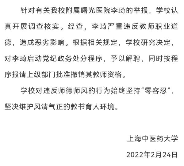继24日公告收到有关反映附属曙光医院教授涉嫌违反师德师风的举报后,上海中医药大学2月25日凌晨即对外发布“处理通报”称:经查,李琦严重违反教师职业道德,造成恶劣影响。
