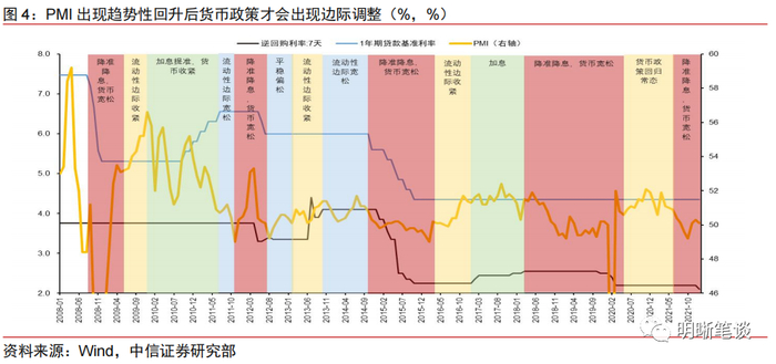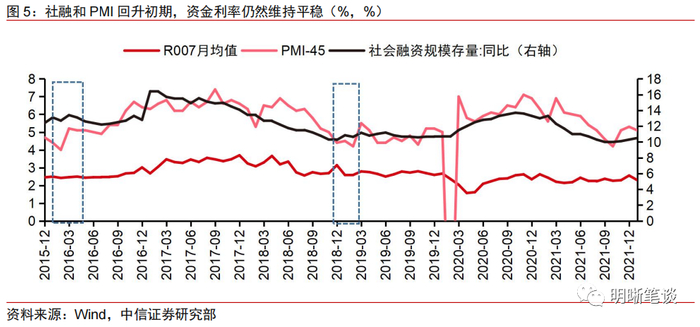 稳增长目标下,货币政策的退出需要在经济确认回暖以后。毋庸置疑,稳增长是今年上半年宏观调控部门的重要任务,靠前发力和充足发力也是货币政策的节奏。而当前制约积极货币政策的因素也比较少,宽货币的约束比较小,央行可以更好地锁定稳增长目标。从经验上看,宽松的货币政策需要等待稳增长趋势确认后才会退出。历史上,PMI和社融增速回升的初期,货币政策仍然会维持平稳的资金面环境;当PMI出现趋势性回升后货币政策才会出现边际调整。