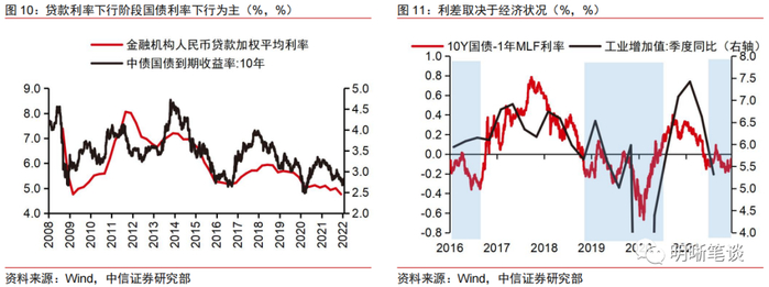其一,降成本目标下,并不会引导国债利率超过政策利率太多。2021年四季度货币政策执行报告提出“引导企业贷款利率下行,有力推动降低企业综合融资成本”,这不同于2021年三季度货币政策执行报告中对降成本局限在“推动小微企业综合融资成本稳中有降”和“推动金融系统向实体经济让利”。需要引导企业贷款利率下行,一方面是发挥贷款市场报价利率改革效能,另一方面是落实优化存款利率监管措施、稳定银行负债成本,这就意味着国债利率作为基准利率不能出现明显回升,政策层面也不会引导国债利率过多超过政策利率。从历史上看,贷款利率下行阶段国债利率多是下行。
