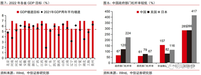 经济增速目标的设定决定稳增长和宽信用的力度。市场对于今年GDP增速目标设定在5%和5.5%这个关键点位之间还存在一些不确定。如果将今年经济增速目标设定在5.5%左右甚至以上,也就意味着稳增长诉求更高,后续宽信用的方向将更为确定;若经济增速目标以5.0%为底线,那么后续宽信用的成色和稳增长的力度可能将偏弱。从目前公布的各省份两会内容看,绝大多数省份2022年经济增长目标在5.5%以上;各省投资增速目标均持平或高于GDP目标,平均值在8%左右,多数省份超过疫情前的水平。