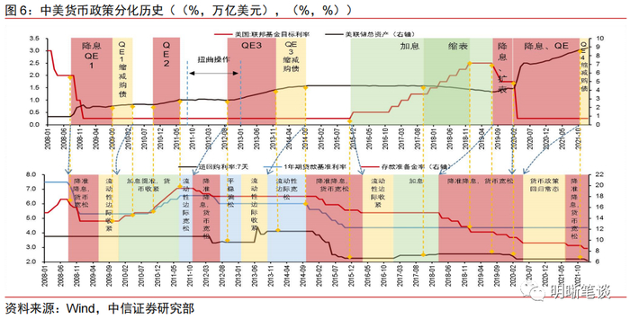 美联储货币政策收紧不改国内货币宽松方向。市场对美联储逐步收紧对国内货币政策的影响还存在一定的担忧,也有部分投资者对2021年四季度货币政策执行报告中增加了对海外货币政策加速收紧的阐述而增加了国内货币政策受到美联储货币政策制约的担忧。我们认为,随着中国货币政策更加“以我为主”,中美货币政策在过往也常出现分化和错位,且当前中美利差在80bps左右、美元兑人民币汇率在6.3左右,相比历史上中美货币分化明显的2014年11月~2016年3月(120bps左右、6.1左右)、2018年4月~2019年8月(100bps左右,6.3左右),当前的汇率和中美利差仍然存在一定的安全空间。
