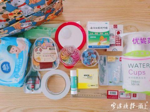 据悉,“爱心包”里有针线包、头绳、小镜子、梳子等生活类物品;也有便利贴、圆规、修正带、胶水、尺子、小夹子等学习类工具;还有创口贴、医用碘伏棉棒、儿童湿巾等卫生保健类物品,非常全面。