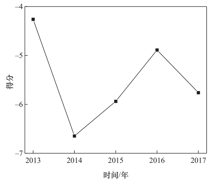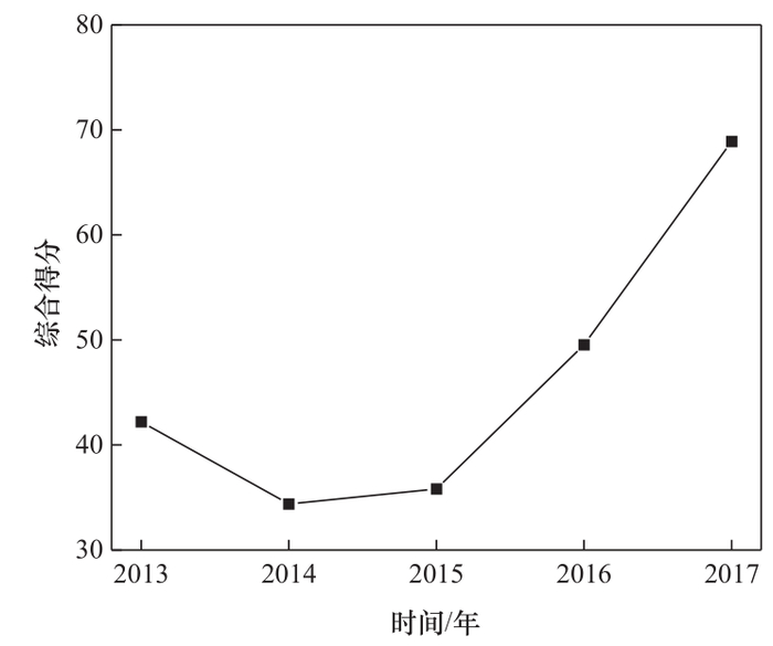 在层次分析法确定权重的基础上,利用综合积分法计算我国食品工业 2013—2017 年的综合得分,计算结果见图 1。