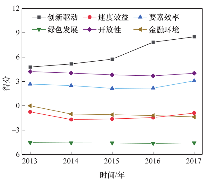 发展水平综合得分只能反映食品行业的整体情况,为了进一步掌握食品工业的具体发展情况,本文计算了 2013—2017 年食品工业发展评价体系中 6 个一级指标的得分(见图 3)。通过综合评价可以发现:创新投入水平不断提升,创新产出水平涨幅较小;速度效益水平有待提升,亏损深度情况有所改善;资本效率水平逐年下降,能源消耗总额较为稳定,能源效率水平较为低下;出口贸易水平逐年降低,外商投资水平有所回升;商业银行不良贷款率逐年上升、资产利润率有所下跌,金融环境还需优化。