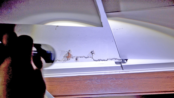 余女士的邻居陆先生告诉记者,他家也出现了类似的情况,其中卫生间内尤为严重。陆先生掀开卫生间的吊顶,可以看见上方墙壁上有一条明显裂痕,部分石灰已经脱落。陆先生讲,一楼住户是去年6月份开始装修的,之后二楼便出现了裂缝,因此他们怀疑自己家的问题与楼下装修有关。