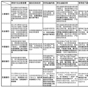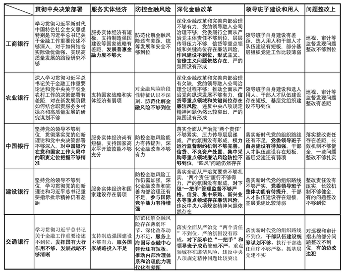 中央第十五巡视组苏波在反馈时指出,农业银行存在的问题主要有:深入学习贯彻习近平总书记关于金融工作重要论述和党中央关于农业农村工作的决策部署有差距,对在新发展阶段如何结合职责服务乡村振兴和高质量发展的研究谋划不够,支持国家战略和实体经济有弱项;对金融风险阶段性特征认识不深刻,防范化解金融风险不够到位;深化金融改革和完善内部治理有欠缺,党的领导融入公司治理全过程不够;推动全面从严治党向纵深发展不够有力,信贷等重点领域和关键岗位存在廉洁风险,违反中央八项规定精神问题仍然比较突出,严的氛围没有形成;领导班子自身建设和选人用人、干部人才队伍建设存在短板,基层党组织建设不够到位;巡视、审计等监督发现问题整改有差距。中央第十巡视组组长苗庆旺在反馈时指出,中国银行存在的问题主要是:坚持党的领导不够到位,贯彻落实党的创新理论和党中央决策部署不够深入,对中国银行在党和国家工作大局中的职责定位把握不够精准,服务实体经济尚有短板,支持国家高水平开放效能不够充分,防控金融风险能力有待提升,深化金融改革不够有力;落实全面从严治党“两个责任”不够紧实,压力传导层层递减,严的氛围没有形成,权力运行监督制约机制不够完善,信贷、不良资产处置、集中采购等重点领域廉洁风险防控不够到位,“四风”问题仍然存在;落实新时代党的组织路线还有不足,党委领导班子自身建设有待加强,干部人才队伍建设存在短板,基层党建还有弱项;落实整改责任存在差距,长效机制不够健全,一些问题整改不够扎实。中央第十巡视组组长苗庆旺在反馈时指出,建设银行存在的问题主要是:坚持党的领导不够到位,学习贯彻党的创新理论和习近平总书记重要指示批示精神仍有差距,服务实体经济和国家建设存在弱项,防控金融风险工作仍需加强,深化金融改革和完善内部治理还有不足,参与国际竞争能力有待增强;落实全面从严治党要求不够扎实,“两个责任”履行不够得力,严的氛围没有形成,对下级“一把手”管理监督不够严格,信贷、集中采购、新兴业务等重点领域存在廉洁风险,违反中央八项规定精神问题依然存在;落实新时代党的组织路线不够严实,党委领导班子整体功能有待提升,干部人才队伍建设存在短板,基层党建比较薄弱;整改责任没有压实,长效机制不够健全,有的问题整改不够到位。中央第二巡视组组长王新哲在反馈时指出,交通银行存在的问题主要是:学习贯彻习近平总书记关于金融工作重要论述不到位,发挥国有大行作用不够,发展战略不够清晰;支持制造强国建设不够有力,服务国家战略投入不足,防范化解金融风险存在薄弱环节,深化改革动力不足,服务上海国际金融中心建设还有短板,推动内部治理体系和治理能力现代化有差距;落实全面从严治党“两个责任”不到位,严的氛围没有形成,对下级单位“一把手”和领导班子成员管理不严,重点领域存在廉洁风险,违反中央八项规定精神问题比较突出;落实新时代党的组织路线不到位,干部队伍建设统筹谋划不够,执行干部选任程序不够严格,抓基层党建不实;对巡视和审计指出的部分问题整改不到位,有的边改边犯。