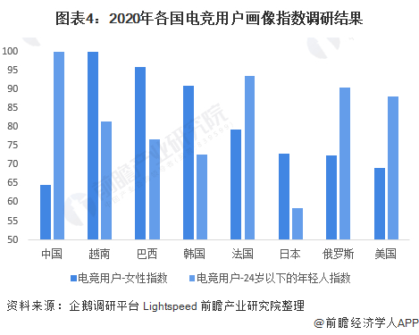 据企鹅调研平台与Lightspeed全部调研结果,目前,韩国、巴西和越南的电竞用户中,女性占主要地位,女性用户指数均超过90;而中国和美国的24岁以下年轻人电竞用户指数相对较高,均超过85。值得注意的是,中国女性指数排在调研国家之末,在女性用户的普及上仍然需要做出较大的努力。