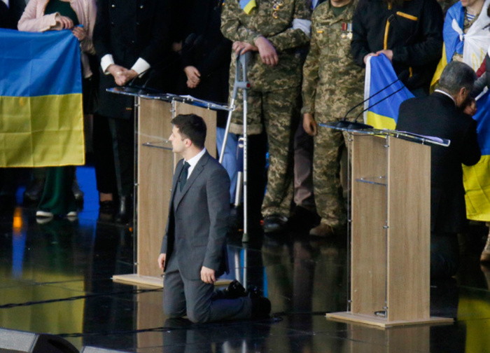令波罗申科没有想到的是,泽连斯基竟突然使用了一个狠招。泽连斯基听到这句话后往前走了两步,突然跪了下去,并表示:“我从来不会向普京下跪,我只会向乌克兰的人民下跪。”