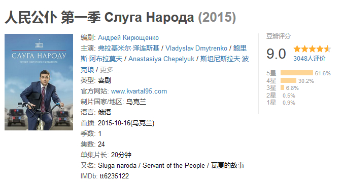 就连国内某瓣评分也显示,《人民公仆》有着高达9.0的评分,这也让泽连斯基一跃成为乌克兰人尽皆知的国民喜剧演员,堪称乌克兰的卓别林。