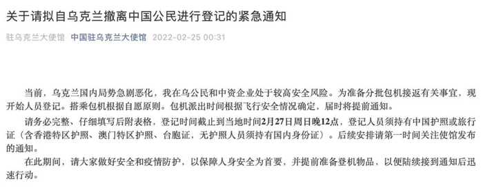 乌克兰局势骤然紧张,在乌中国同胞的安危牵动祖国亲人的心。中国驻乌克兰大使馆25日凌晨发布《关于请拟自乌克兰撤离中国公民进行登记的紧急通知》。中国驻乌克兰大使馆新闻参赞丁建伟说,接下来将是乌局势变化最为紧张的时期,使馆将继续做好各项工作,保护好广大在乌中国同胞。