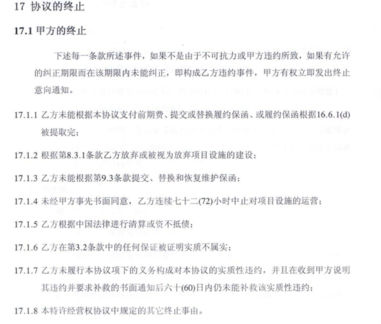 记者查阅了《特许经营协议》里涉及协议终止的部分,其中政府方终止协议的条款如下: