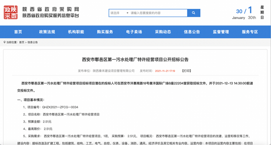 记者查阅陕西省政府采购网发现,陕西秦禾建设项目管理有限公司于2021年11月21日发布了《西安市鄠邑区第一污水处理厂特许经营项目公开招标公告》,并于2021年12月14日发布中标结果。而截至目前法院审理结果仍未公布。