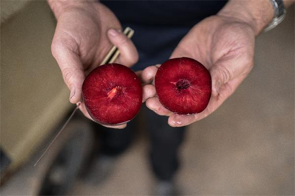 众所周知,澳洲是一个“骑在羊背上的国家”,有史以来就是一个农业大国。独立的大陆保留了纯粹的自然环境,在培育物种方面具有得天独厚的优势。按照澳洲的传统,李子一直备受推崇,所以,李子成为了澳洲农业研发的突破口。这项“超级李子”的研究,计划在5000多个品种中筛选出优秀基因,经过一代代的融合、改良,最终培育出在外观、口味、营养上都卓尔不凡的大满贯品种。颇似明治维新时期的日本和牛育种,整个澳洲也在热切期待着“和牛李”的诞生。 转眼到了1997年,和往常一样,昆士兰农业部的研究人员将两种李树进行嫁接,试图得到抗病性更好的新品种。然而,这一次,意想不到的事发生了。这些新培育的植株生长旺盛,枝叶繁茂,结出的果实通体深紫,切开的果肉如燃烧的红宝石般艳丽剔透。于是,Queen Garnet胭脂女王李——一个美丽的名字诞生了。Queen象征着它来自女王赐福之地昆士兰(Queensland),Garnet则用来形容它迷人的绯红。