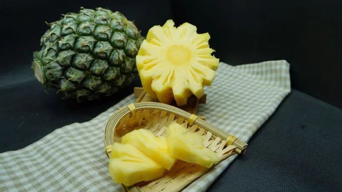 小小一颗甜度更是惊人,最高能达18°,中间最甜,接近皮的果肉才带点微酸。果肉纤维很少,连菠萝中间的杆都是脆甜的,不塞牙。