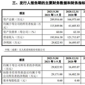 在业务体量上,2018年至2020年与2021年前三季度,中航无人机的营业收入分别为4742.44万元、25113.94万元、121713.87万元和193916.38万元,扣非后的归母净利润分别为147.04万元、-985.82万元、16482.30万元和29171万元。