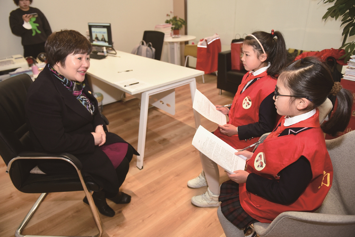 2月18日,嘉兴市文贤学校的两名小记者采访了市第九次党代会代表、嘉兴市党员志愿服务中心(96345社区服务求助中心)党支部书记骆叶青。
