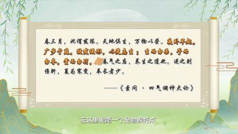 这段话说的就是春季应该如何养生。“春三月,此谓发陈,天地俱生,万物以荣”,这四句话讲的是春季的物候特点。“春三月”指阴历的正月、二月、三月,涵盖了六个节气。