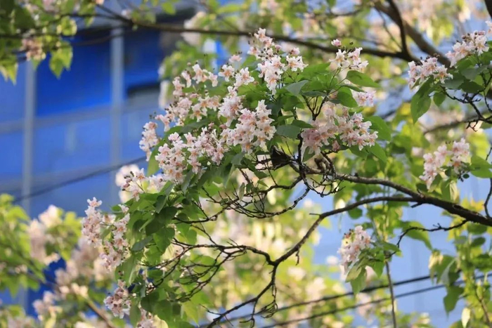 楸树:楸,紫葳科小乔木,高8-12米。叶三角状卵形或卵状长圆形,宽达8厘米,顶端长渐尖,基部截形,阔楔形或心形,叶面深绿色,叶背无毛;叶柄长2-8厘米。顶生伞房状总状花序,有花2-12朵。花萼蕾时圆球形,顶端有尖齿。花冠淡红色,内面具有2黄色条纹及暗紫色斑点。