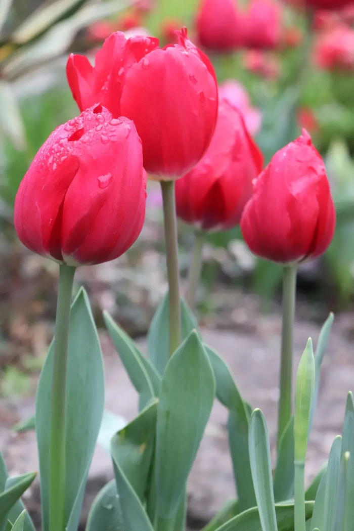 郁金香:百合科郁金香属的多年生草本植物,具球茎。郁金香的叶3-5枚,条状披针形至卵状披针状,花单朵顶生,大型而艳丽,花被片红色或杂有白色和黄色,有时为白色或黄色,长5-7厘米,宽2-4厘米,6枚雄蕊等长,花丝无毛,无花柱,柱头增大呈鸡冠状,花期3-4月。郁金香花语:博爱、体贴、高雅、富贵、能干、聪颖、祝福、永恒。