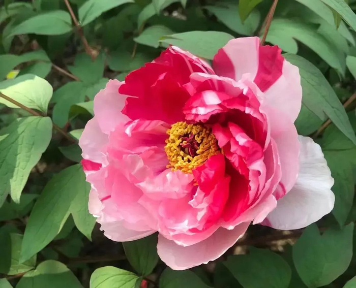 牡丹:双子叶植物纲芍药科芍药属植物。为多年生落叶灌木,茎高达2米,分枝短而粗。叶通常为二回三出复叶,表面绿色,无毛,背面淡绿色,有时具白粉,叶柄长5-11厘米,和叶轴均无毛。花单生枝顶,苞片5,长椭圆形;萼片5,绿色,宽卵形,花瓣5或为重瓣,玫瑰色、红紫色、粉红色至白色。