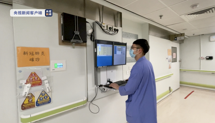 在医院的走廊可以看到许多屏幕。医护人员通过不同的屏幕,随时观察病人的血压、血氧含量等不同数据的变化。沈海平对总台记者说,这是为了掌握负压病房内病人情况所使用的视像观察系统。出于安全需要,医护人员无法随时出入负压病房检查病人情况,因此该系统对医生救治重症患者十分重要。