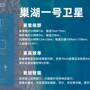 与海丝一号卫星相比,巢湖一号卫星进一步优化了卫星平台和雷达载荷设计,使得卫星在成像幅宽、分辨率、最大成像时长、数据传输、轨控等核心能力上均有了显著的提升,并增加了区域多点目标的连续成像能力、精密定轨能力及在轨AI处理功能。